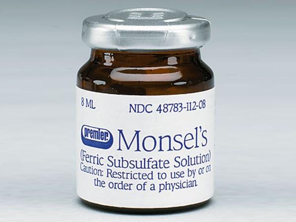 Learn all about Monsel solution uses, side effects, mechanism, preparation. Monsel’s solution consists of 20% ferric subsulfate. It is used to produce hemostasis after biopsies of the skin and cervix. It is applied to the skin in the same manner as aluminum chloride. There is a small risk of tattooing the skin through iron deposition. One major nuisance in using Monsel’s solution is that the iron precipitates around the top of the container, making it difficult to open. Aluminum chloride containers are always easy to open.