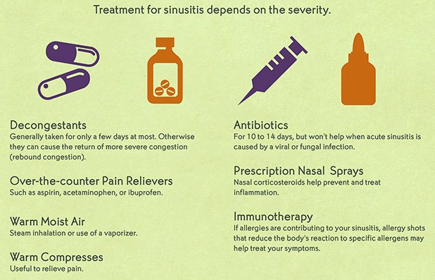 A sinus infection treatment depends upon type and symptoms. Common viral sinus infection treatment includes painkiller (for pain and fever relief), antibiotics (to avoid secondary infection), nasal sprays, nasal cleaners