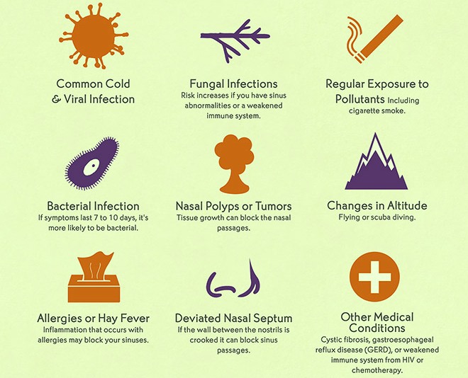 A bad cold is often mistaken for sinusitis (sinus disease). A sinus infection contagious or allergic, begins when mucus builds up on the lining of sinuses. Bacteria, viruses, and fungi in the body may also reproduce and attack the inflamed sinuses. People with allergies, asthma or having weak immunity are more likely to have sinus infections. Swimmers and divers are also at high risk to sinusitis due to pressure on sinus cavities.