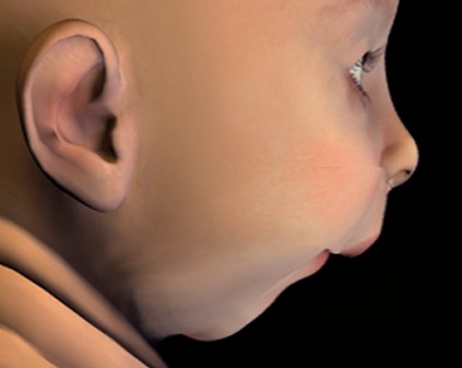 Micrognathia can present as a birth defect in numerous syndromes, including cleft lip, cleft palate, Pierre Robin sequence or syndrome, Stickler’s syndrome, Beckwith-Wiedemann syndrome, hemifacial microsomia, Treacher Collins syndrome and others. A complex syndrome characterized mainly by aural, oral, and mandibular developmental anomalies which may vary from mild to severe and frequently involve one side of the body. Vertebral anomalies, epibulbar epidermoids, mental retardation, and numerous other anomalies are frequently associated. Orofacial anomalies differ from those in mandibulofacial dysostosis which are usually symmetrical. The presence of hypertelorism may indicate aneuploidy.
