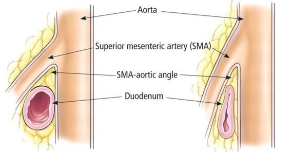 Superior mesenteric artery syndrome (SMAS) is a digestive condition that occurs when the duodenum (the first part of the small intestine) is compressed between two arteries (the aorta and the superior mesenteric artery). This compression causes partial or complete blockage of the duodenum. This rare, potentially life-threatening syndrome is typically caused by an angle of 6°–25° between the abdominal aorta and the SMA, in comparison to the normal range of 38°–56°, due to a lack of retroperitoneal and visceral fat (mesenteric fat). In addition, the aortomesenteric distance is 2–8 millimeters, as opposed to the typical 10–20. However, a narrow SMA angle alone is not enough to make a diagnosis, because patients with a low BMI, most notably children, have been known to have a narrow SMA angle with no symptoms of SMA syndrome