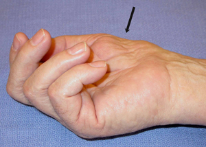 Thenar atrophy due to any cause is usually very noticeable. There might be an obvious dent in the palm or along the outer edge of the base of the thumb. At rest, the thumb may be fixed in a rigid position across the front of the palm. In cases of severe atrophy, it is impossible to bend or move the thumb at all.